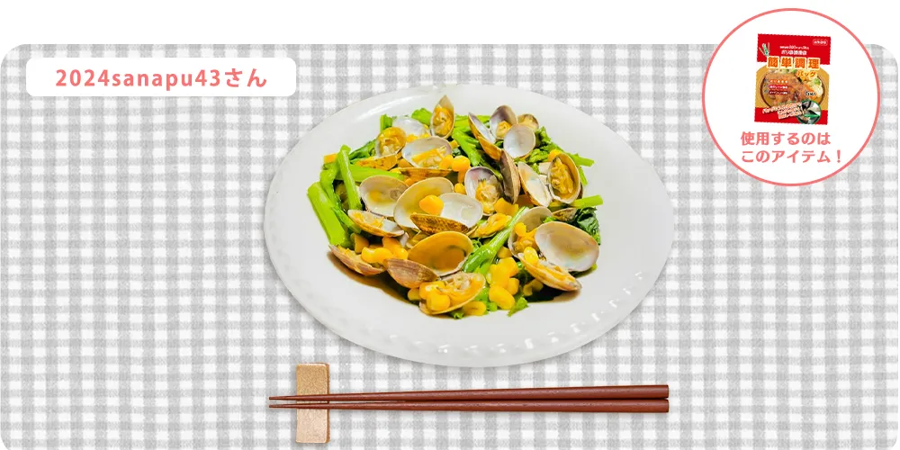 簡単レシピを掲載中 レシピコンテスト 応募レシピ あさりと菜の花の白だし蒸し 春の一品の出来上がり♪ 材料 ・あさり 18個 ・菜の花 100g ・コーン 50g ・白だし 大さじ1 ・水 大さじ1 作り方 ①菜の花を1/3の長さにカットする。 ②材料全てを簡単調理バッグに入れ、600wのレンジで5分チンする。